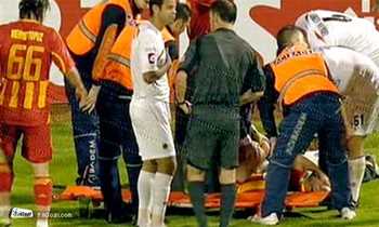 شوكة من التي كانت تستخدم في قطع الحشائش تركها صاحبها وسط الشجيرات، وبدلاً من أن أسدد الكرة، سددت هذه الشوكة لتستقر في قدمي..