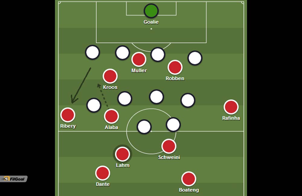 مع انضمام (2) للعمق ومعه الجناح الآخر (10) من الخصم فيفتح زاوية تمرير في المساحة بين الوسط والدفاع للخصم. وتصبح حالة هجومية خطيرة للغاية.