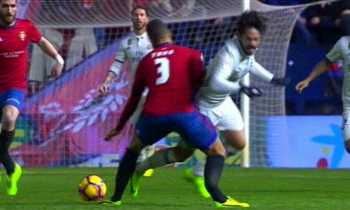 وفي الدقيقة 35 من كرة عرضية داخل الست ياردات حولها بنزيمة بباطن القدم اليسرى لكن سريجو حارس أوساسونا تابعها بيده ليحافظ على التعادل في الشوط الأول.