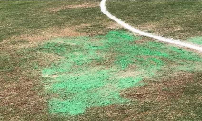 وللتحايل على الموقف، حاولت إدارة الملعب صبغ الأرضية باللون الأخضر، فكانت بتلك الصورة.