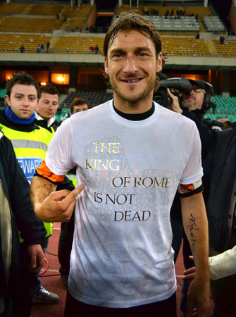"ملك روما لم يمت بعد" كانت تلك هي الرسالة المكتوبة على صدر توتي بعد أن خلع قميصه أثناء أحتفاله المعتاد أمام جماهير الجار الذي وقفت جماهيره تتابع في غضب وغيظ عودة توتي للتسجيل في مرماهم.