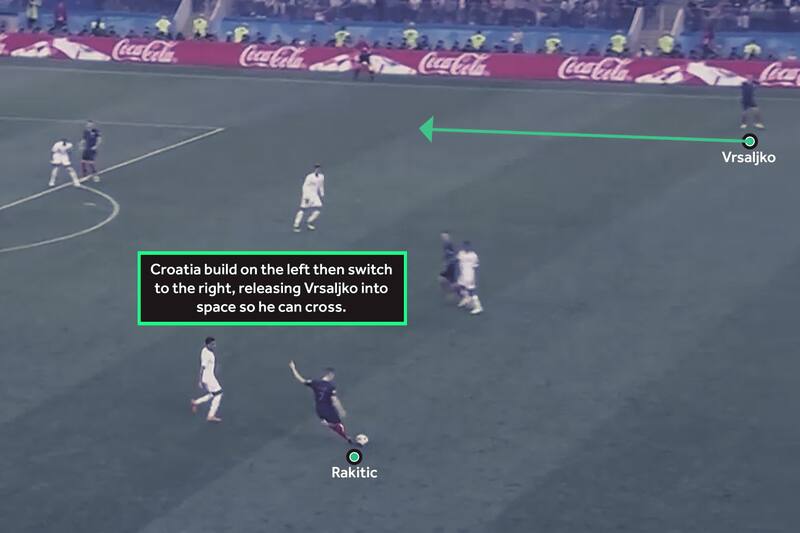 يجيد منتخب كراوتيا جعل اللعب يميل في أحد النواحي ومن ثم يرسل عرضية عكسية للجهة الأخرى ينطلق معها فرسالجكو ليرسل عرضية داخل منطقة الجزاء.