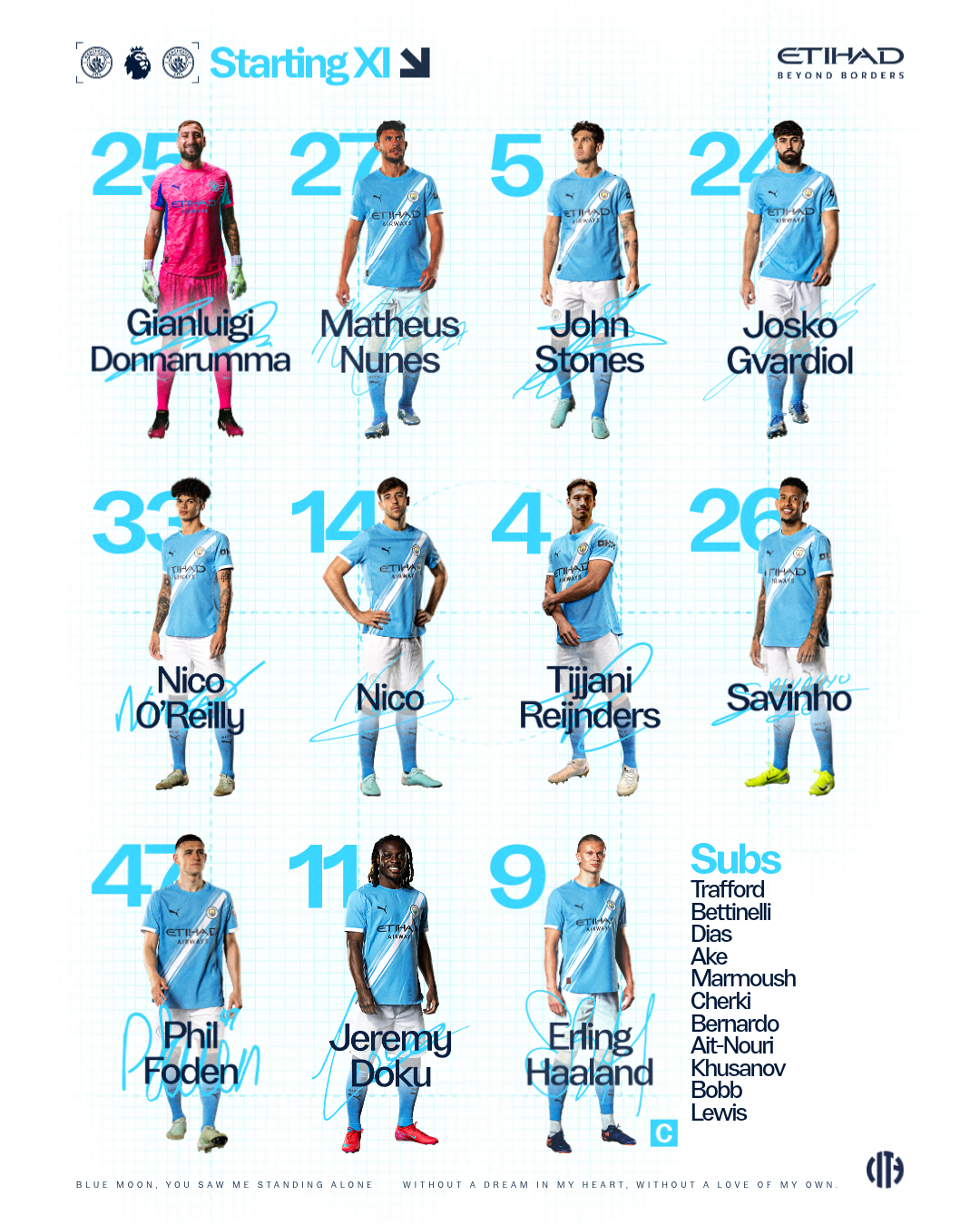 على مقاعد البدلاء: جيمس ترافورد – ماركوس بيتينيلي – روبن دياز – ناثان أكي – عمر مرموش – ريان شرقي – برناردو سيلفا – ريان آيت نوري – عبد القادر خوسانوف – أوسكار بوب – ريكو لويس.