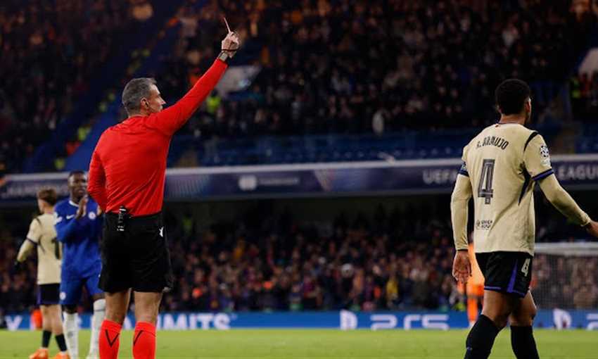 ونال رونالدو أراخو بطاقة حمراء في الدقيقة 44 بعد تدخل قوي ضد كوكوريا ظهير أيسر تشيلسي.