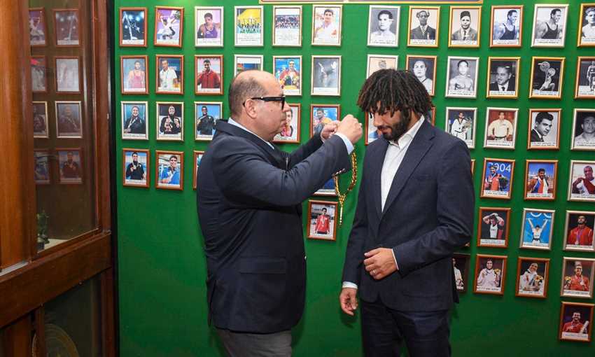 واستقبل إدريس فى مقر اللجنة اليوم الأربعاء، محمد النني بحفاوة كبيرة وفى ختام اللقاء أهدى إدريس بتقليد النني القلادة الأولمبية الذهبية فى حضور شريف القماطي أمين صندوق اللجنة الأولمبية ومحمد الأسيوطي رئيس اللجنة القانونية وياسر عبد العزيز رئيس المنظومة الإعلامية.