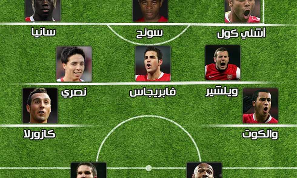 ملحوظة: التشكيل يضم اللاعبين المستمرين في الملعب حتى الآن.. لهذا لا يشمل نجوما معتزلة مثل العظماء دينيس بيركامب وتوني أدامز وروبرت بيرس وإيمانويل بيتيت وباتريك فييرا.