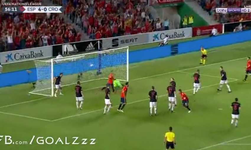 تسديدة رائعة من راكيتيتش على دي خيا ولكن تمر بجانب القائم لتكون ركلة مرمى لصالح اسبانيا.