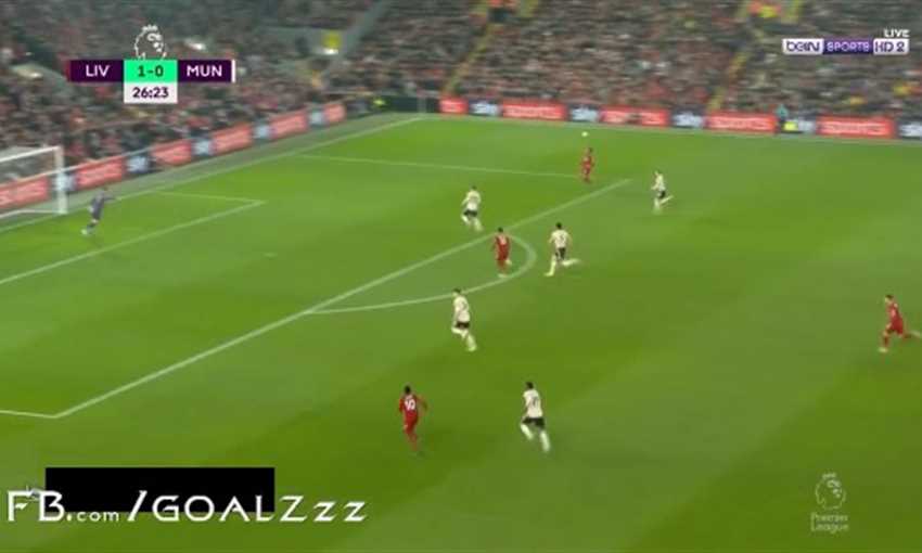 مراوغة رائعة من فيرمينيو لاعب ليفربول للظهير الأيمن لمانشستر يونايتد، وسدد كرة قوية ارتطمت بالدفاع من يسار منطقة الجزاء.