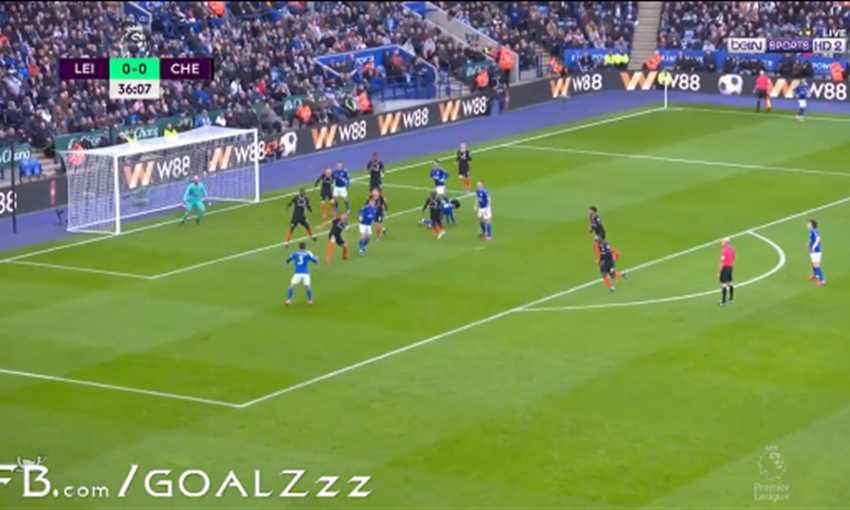 ركلة ركنية لتشيلسي على يمين مرمى ليستر سيتي، نفذها جورجينيو بتمريرة قصيرة لبيدرو الذي مرر كرة طولية إلى داخل عمق منطقة الجزاء إفتقدت الدقة الكافية لتمر من جميع اللاعبين وتتحول إلى ركلة مرمى لأصخاب الأرض.