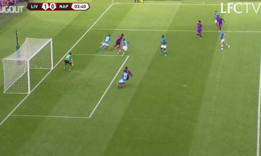 بينية من لورينزو إنسيني وصلت إلى لوزانو الذي حاول التوغل داخل منطقة الجزاء لكن تدخل أرنولد واستحوذ على الكرة لكن انطلق بها بعرض الملعب داخل منطقة جزاء فريق ليفربول، حاول ميرتينس التدخل لاستعادة الكرة لكن أبعدها أرنولد ببراعة.