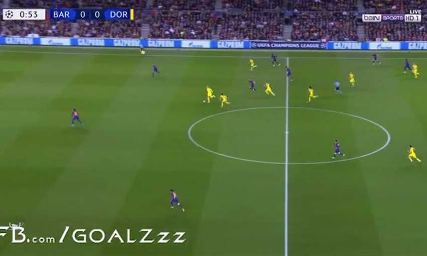 تمريرة رائعة من ميسي في الجهة اليمنى للمنطلق عثمان ديمبلي يلعب عرضية رائعة الى راكيتيتش المتقدم الذي يسدد ولكن تصطدم في الدفاع و يخرجها الدفاع .