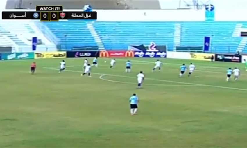 رمية جانبية لصالح غزل المحلة من على يسار منطقة جزاء أسوان.