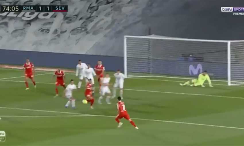 🅰️ وصف الهدف - ركلة حرة مباشرة لإشبيلية في وسط ملعب ريال مدريد من جهة اليسار، نفذت بتمريرة قصيرة لخيسوس نافاس الذي أرسل كرة عرضية إلى داخل منطقة الجزاء إرتقى لها إيفان راكيتيتش برأسية هيأت الكرة لزميله فيرناندو الذي نجح في ترويض الكرة ثم راوغ كاسيميرو بشكل رائع وأطلق تسديدة قوية سكنت شباك الحارس ثيبوه كورتوا.