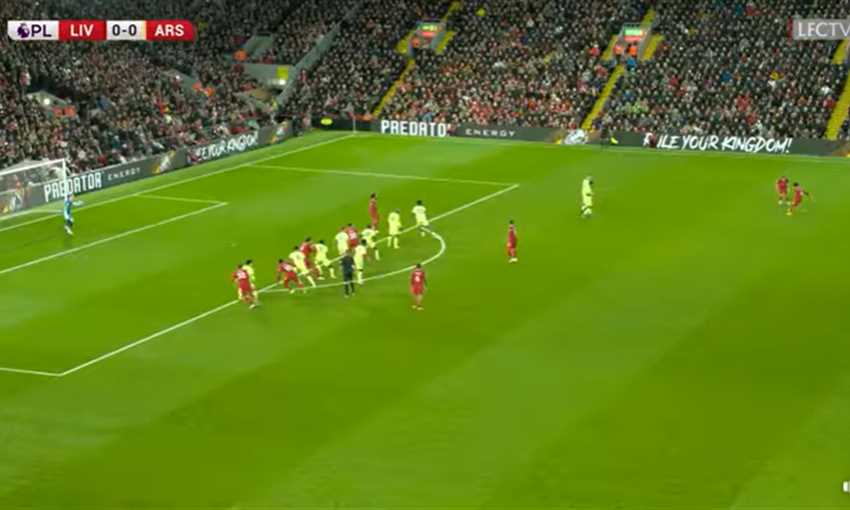 كرة عرضية من تاكيهيرو تومياسو من جهة اليمين قابلها ساكا برأسية من داخل منطقة الجزاء أبعدها دفاع ليفربول عن مناطق الخطورة.