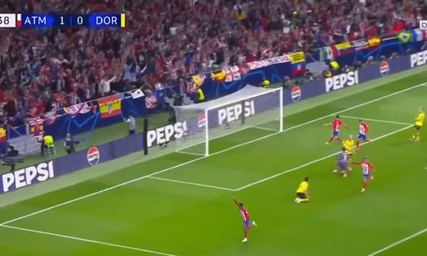 تسديدة قوية من أنطوان جريزمان لاعب أتليتكو مدريد من يسار منطقة الجزاء ارتطمت بنيكو شلوتيربيك مدافع دورتموند ومرت لركلة ركنية.