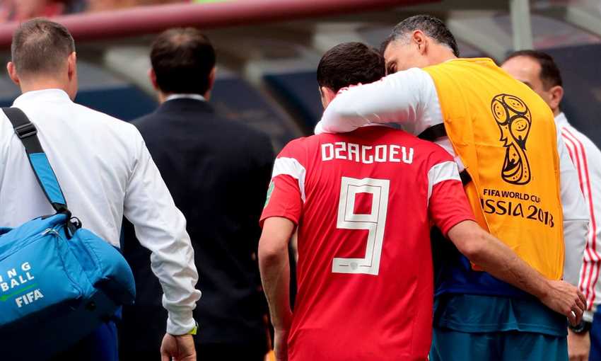 غاب ألان دزاجويف لاعب وسط وجناح منتخب روسيا عن رحلة الفريق المغادرة إلى سان بيترسبورج استعدادا لمواجهة مصر بسبب الإصابة مما تسبب في غيابه عن تدريب اليوم.