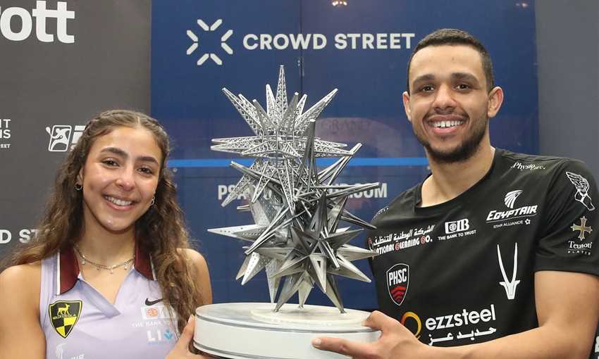 توج مصطفى عسل لاعب بالم هيلز وهانيا الحمامي لاعبة وادي دجلة بلقب بطولة الأبطال للاسكواش 2026.